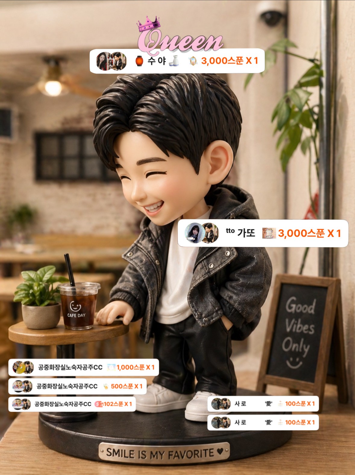 다들 따뜻한 마음 감사합니다 오늘 와준 씨씨 동생 귀인 ㅋㅋㅋㅋ 우리의 의리 아주 재미졌구 더 스며듭시다요!! 샤코 내방에 처음 으로 스푼 쏴주고 고맙다 더 친해지자 형이랑 ㅋㅋ 여름이도 뉴페이스!! 인사 와줘서 고맙구 루미도 너무 고마워 다요 1000스푼 캬 백사모 지린다!! 리스트도 고맙다 형이랑 더 스며듭시다 이상 다들 더 말안해두 알지?? ㅎㅎ 다밍이 ㅎㅎ 깃발 만카이 조금 남았을때 센스있게 뒷자리 맞춰주기 센스모냐구 ㅋㅋㅋ 항상 고맙다밍~~! 울 최애쿤 시간대가 봄3rd 스푼 나올때라서 내가 풍선으로 보여가지고 효과가 ㅋㅋㅋ 나중에 다시 보여준다고 배려 해줘서 고마워 ㅎㅎ 하마터면 이쁜거 다 풍선으로 볼뻔 케케케케 고마워 내사람들아!!! 언급 안한 우리 친구들 평소에 다들 내가 얼마나 아끼는거 알지?? ㅎㅎ 항상 감사하게 생각하구 임할게요!!! POST
