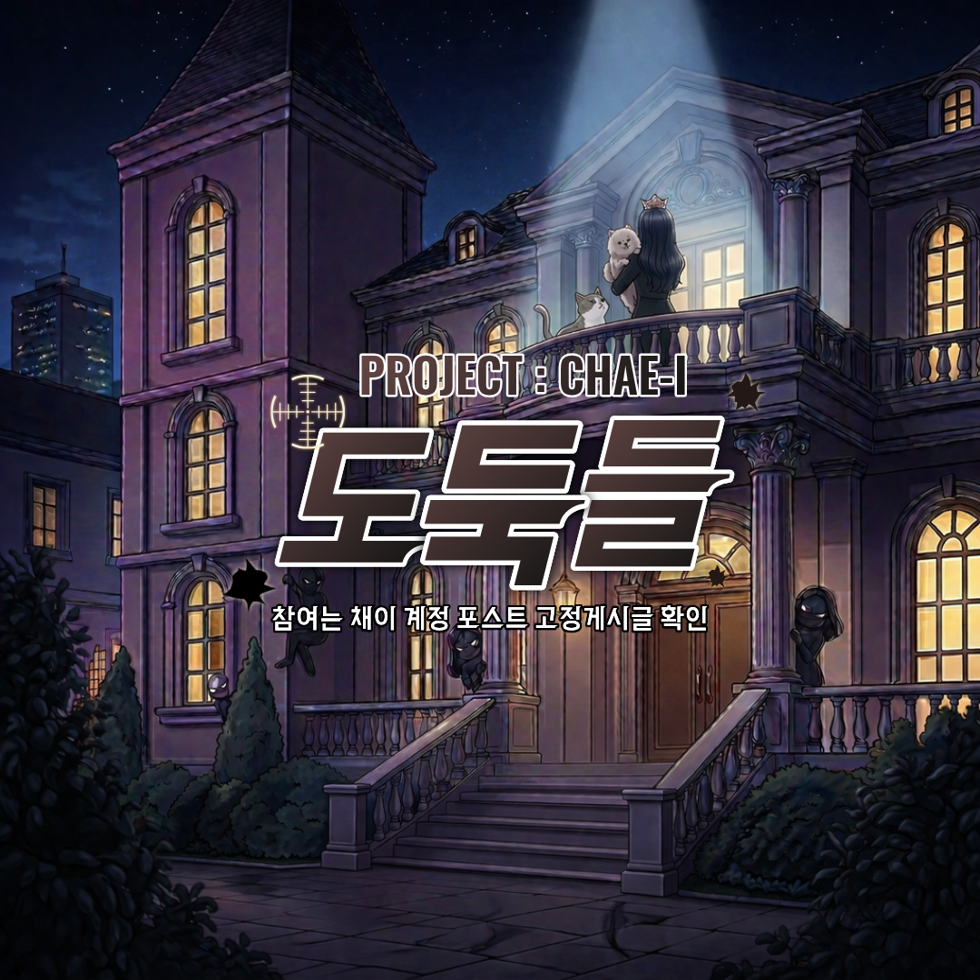 [ PROJECT : CHAE-I ] Episode 02. 기밀 작전 : 도둑들 🥷 ➥ 본 프로젝트는 매달 새로운 컨셉으로 진행되는 채이만의 특별한 룰렛 이벤트입니다. ✦ INVITING : PROJECT CHAE-I ✦ "이 메시지를 읽고 있다면, 당신은 이미 우리의 대담한 계획에 초대된 것입니다." 🔍 1. 작전 개요 ① 기간: 4월 한 달간 (4/1 수요일 밤 10시 첫 작전!) ② 장소: 베일에 싸인 채이의 비밀 저택 (잠입 및 보물 탈취) ③ 목표: 저택 곳곳에 숨겨진 진귀한 보물들을 모두 털어내십시오. 2. 요원의 장비 🎒 ① 보급품: 이 초대장에 댓글을 남긴 요원에게 [기본 백팩(10칸)]을 지급합니다. ② 업그레이드: 작전 중 당신의 능력에 따라 [보부상 가방]과 [비밀 캐리어]를 손에 넣을 수 있습니다. 3. 비밀 계약 체결 (필독!) ✅ ① 아래 댓글에 🥷 이모티콘 하나를 남기는 것으로 계약은 성립됩니다. ② 복잡한 서류는 필요 없습니다. 오직 이모티콘 하나로 당신의 합류를 증명하십시오. 4. 경고 및 주의 사항 🚨 ① 저택의 주인 채이와 경비병 몽글&메리의 감시망을 피하십시오. ② 검거될 경우 10분간 작전지에서 강제 퇴거 조치됩니다. (방어 아이템 확보 권장) "상세 작전 지침은 4월 1일 현장에서 공개됩니다. 행운을 빕니다." 🧭