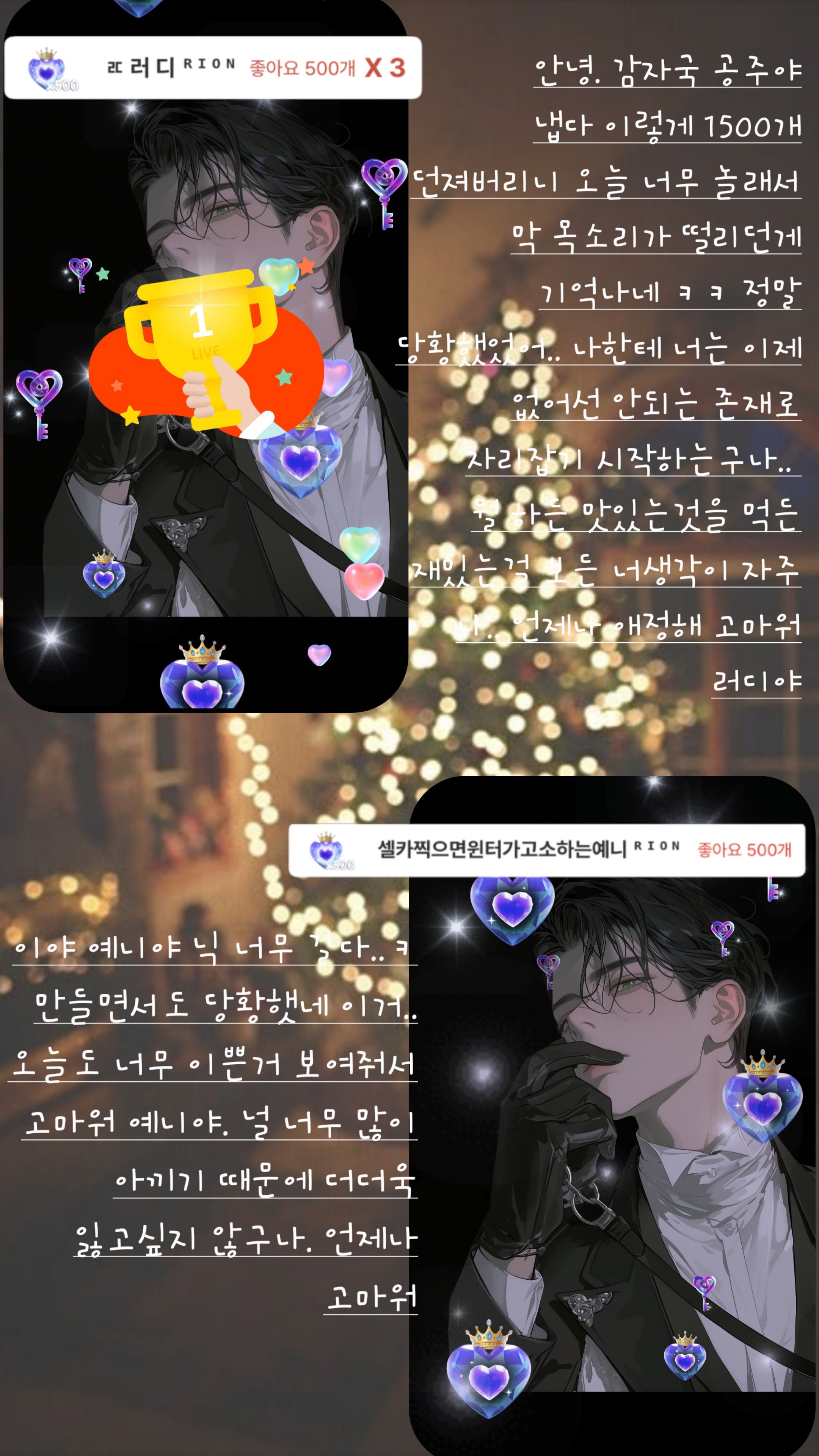 안녕하세요. 리온입니다. 이번 11월은 너무나 다사다난하고 기쁜일 슬픈일 다양한 추억들이 공존하는 달이었네요. 좋은 인연과 좋은 추억 가지고 행복한 한달 보냈습니다. 12월도 잘 부탁합니다. 항상 애정하고 사랑해주셔서 고맙습니다. 당신들의 마음이 제가 나아갈수있게 힘을 보태줍니다. 당신들의 기억속에 나는 어떤사람인가요. 좋은 기억만 남았으면 좋겠습니다. 바람에 잎사귀가 날아가듯 너무 가벼운 관계가 아닌 서로를 보듬어주고 아껴주는 단단한 매듭이 되었으면 하는 바램입니다. 저도 많이 애정합니다. 날씨가 많이 춥습니다. 옷 따듯하게 입고 맛난것 많이 먹고 연말 가족들과 화목하고 행복하게 마무리하길 기원합니다.