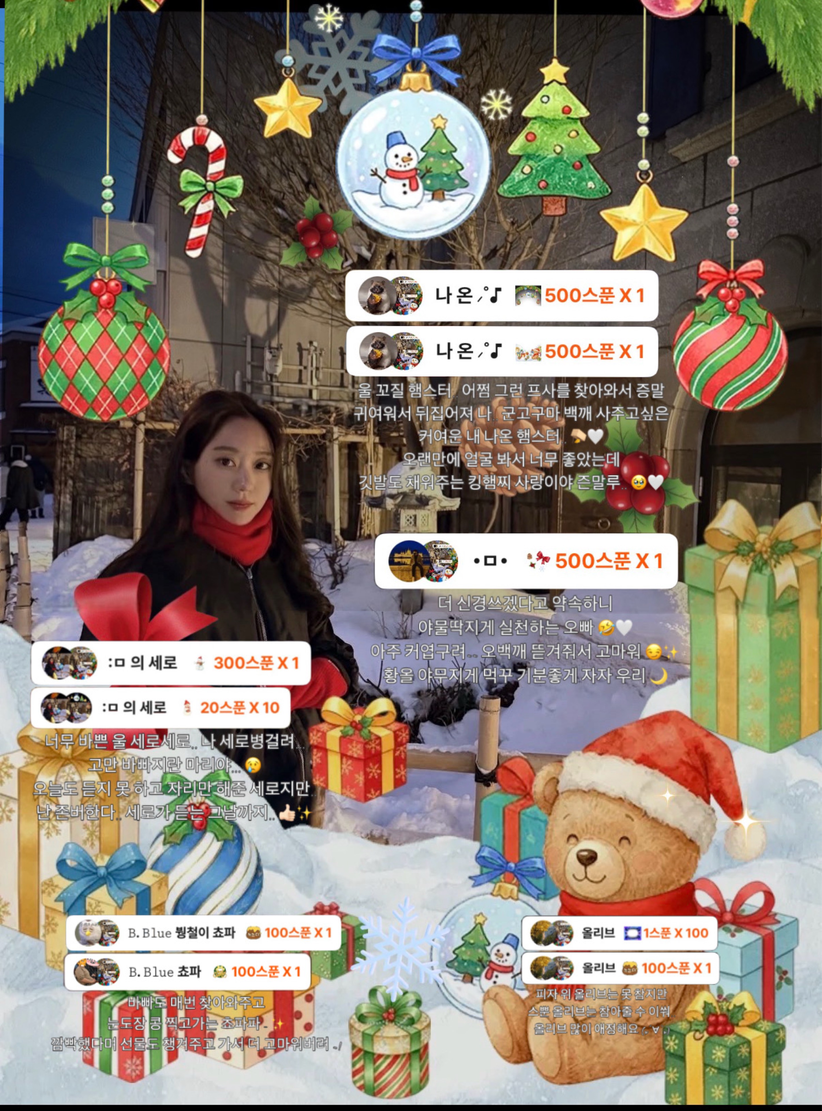 크리스마스가 이제 일주일 남았네요 😖.. 크리스마스 시즌스푼 중 가장 먼저 선물해주신 분의 이름을 넣어서 박제해드립니다! 그리고.. 🎁 1~50스푼 = 뽑기권 1장 100스푼 ~300스푼 = 뽑기권 3장 500스푼 ~ 800스푼 = 뽑기권 6장 1000스푼 ~ 1500스푼 = 뽑기권 = 10장 2000스푼 ~ 3000스푼 = 뽑기권 30장 7486스푼 = 뽑기권 70장 남은 기간동안 선물해주신 분들 중 랜덤으로 닉네임을 뽑아 네모가 직접 준비한 선물을 드립니다! ( 시즌스푼이 사라지면 자동 종료됩니다.)